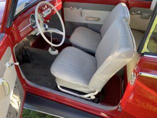 Beautifully restored 1965 VW Beetle Cabriolet in Robin Red. The car is body-off restored, with new front and rear brakes, 1600cc engine (50 hp), seats reupholstered, everything impeccably restored during the Beetle restoration. The body was painted, including the inside of the wheel arches, so you can quickly see how well this Beetle Cabriolet has been restored, with original whitewall tires and even the spare wheel.
